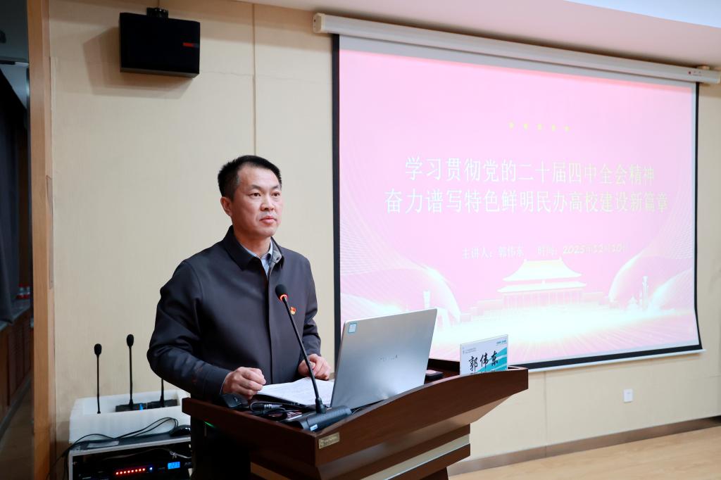 郭伟东以“学习贯彻党的二十届四中全会精神,奋力谱写特色鲜明民办高校建设新篇章”为题,围绕全会重大意义、习近平总书记重要讲话精神等七个方面,系统解读全会精神,重点阐释“十四五”时期发展成就、“十五五”时期的发展定位、形势判断、指导思想及主要目标。他强调,要深刻领会全会精神,将其与学习习近平新时代中国特色社会主义思想贯通起来,准确把握贯穿其中的立场、观点、方法和实践要求,并以对标对表、守正创新等举措推动党中央决策部署落地见效。